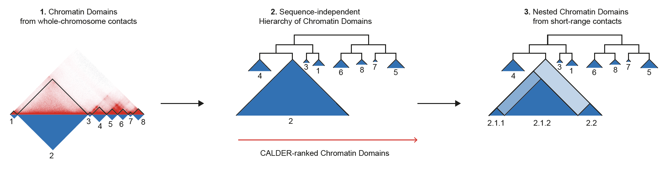 CALDER contains three modules: (1) compute chromatin domains; (2) derive their hierarchical organization and obtain sub-compartments; (3) compute nested sub-domains within each compartment domain.